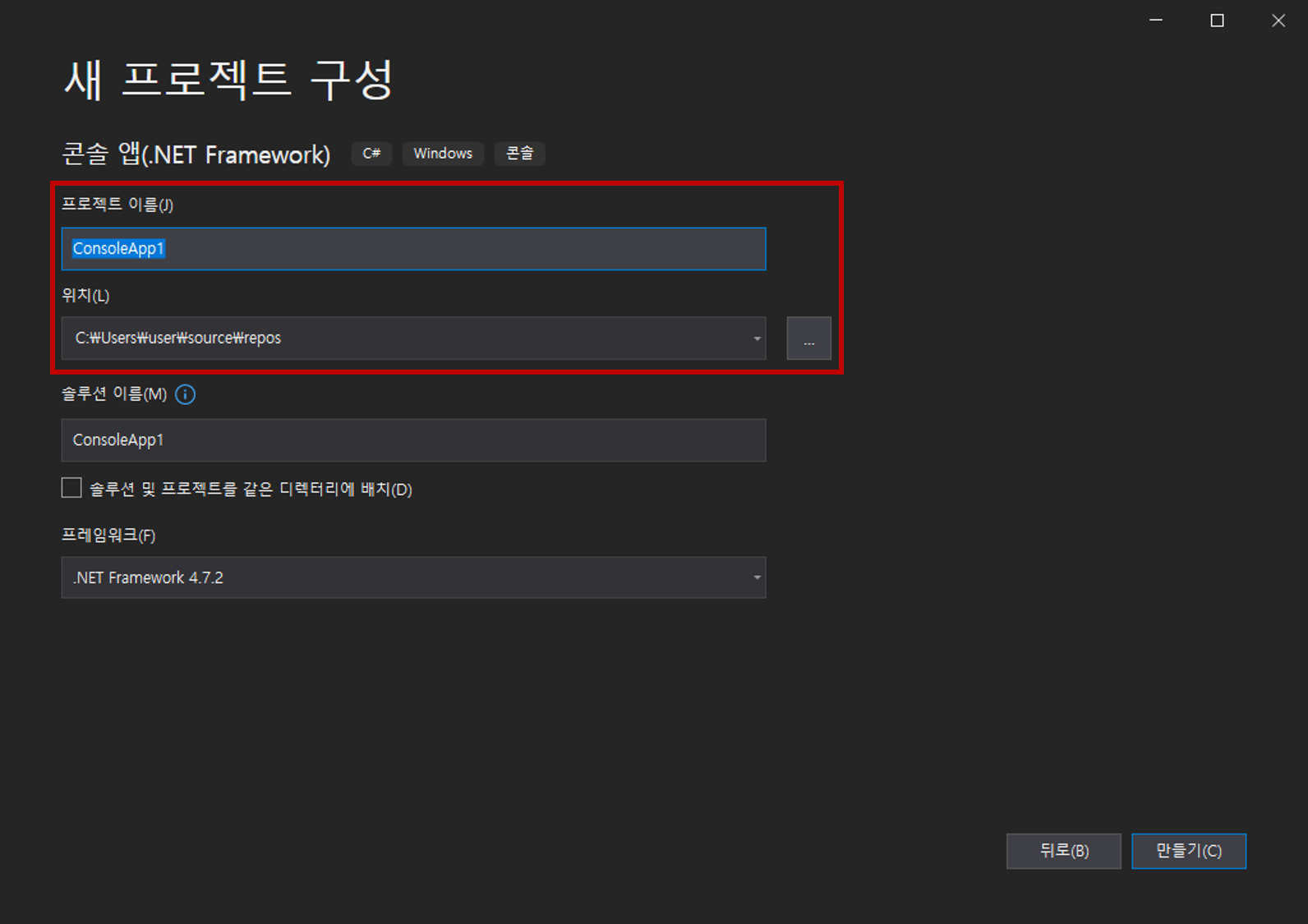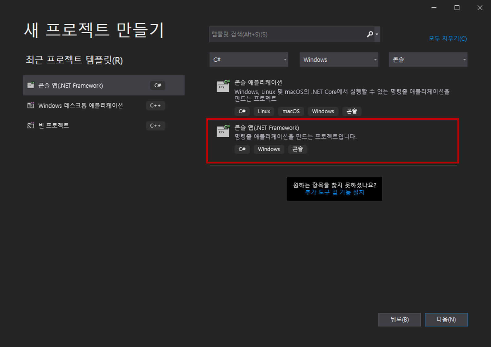 3) '콘솔 앱(.NET Framework)' 선택 후 '다음' 클릭