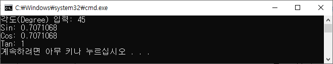 Console.Write("각도(Degree) 입력: ");