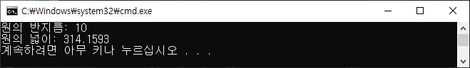 Console.WriteLine("원의 넓이: {0}", area);